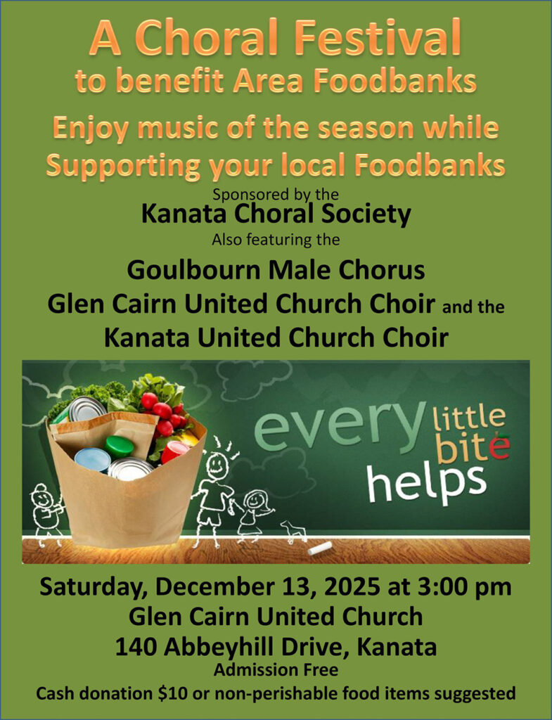 Come celebrate the season with beautiful music while supporting your community. This special concert, sponsored by the Kanata Choral Society, will feature performances by the Goulbourn Male Chorus, Glen Cairn United Church Choir, and Kanata United Church Choir.
